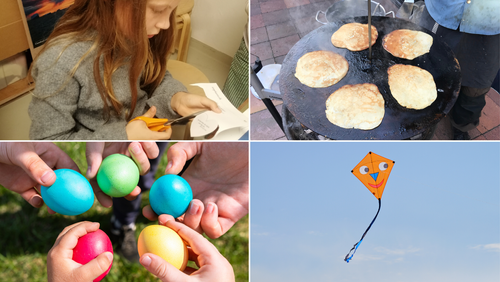 Vi fejrer kirkens fødselsdag med lækker lagkage. Herefter går vi i gang med kreative aktiviteter, hvor vi farvelægger og laver vores egne drager med himmelfarts- og pinsemotiver.