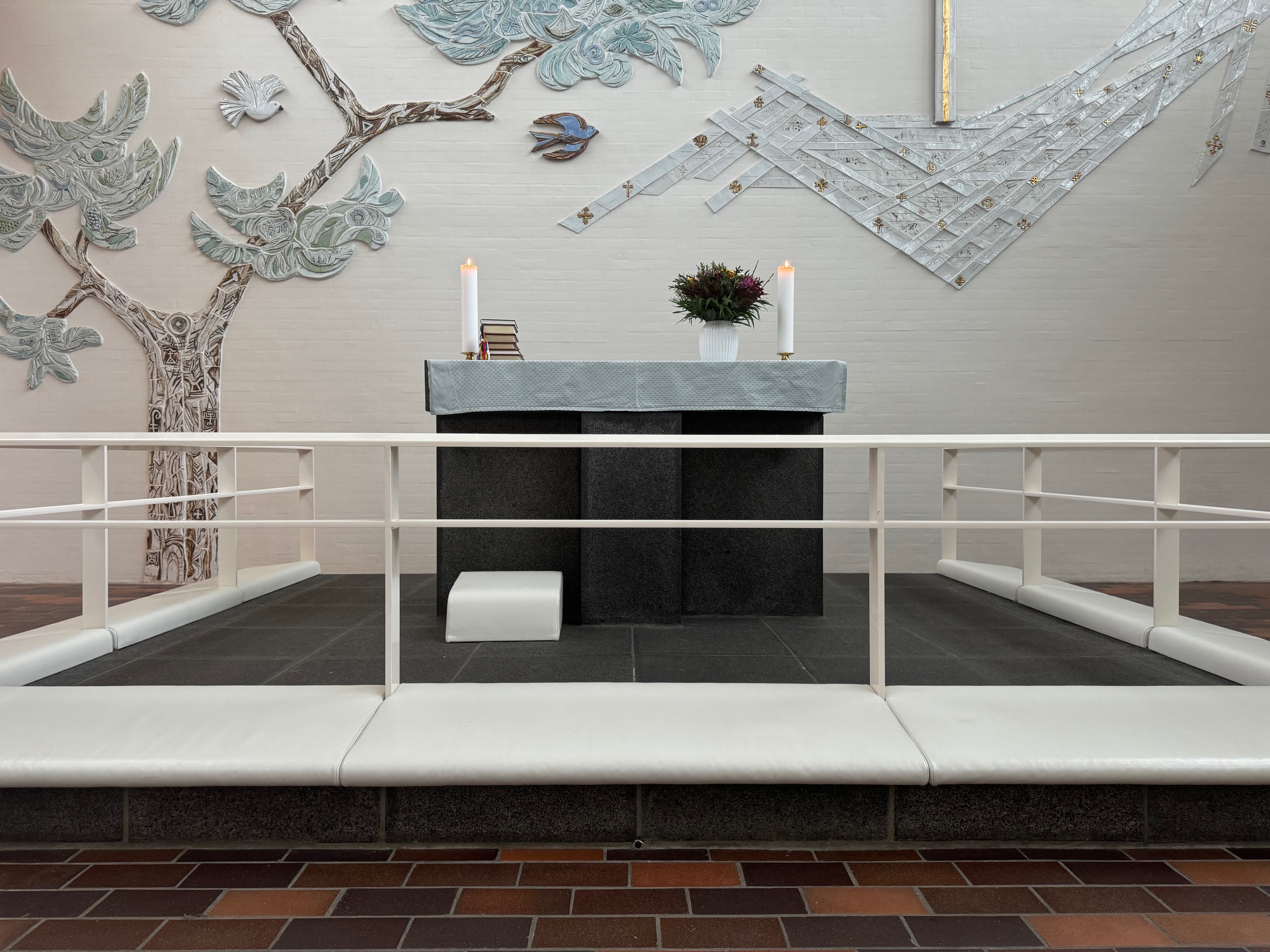Tilbage var efterhånden kun en udsmykning af selve kirkerummet, først og fremmest væggen bag alteret. Menighedsrådet bad tre kunstnere om at indsende projekter, og rådet valgte et keramikrelief af Tue Poulsen, der blev opsat og indviet i 1992. Relieffet viser et livstræ omgivet af fugle, et kors og et mønster af lysstråler, der falder oppefra og nedad mod korsets fod.